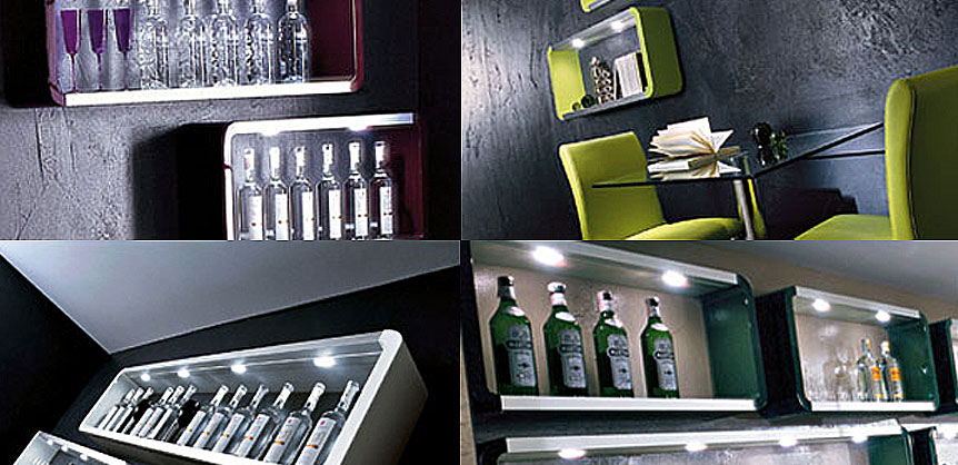 Zidne jedinice TIFFANY čine samostalni odjeljci od eloksiranog aluminija gornjih i donjih profila, te bočnih elementa od lakiranog poliuretana visoke gustoće. Integrirana LED rasvjeta u gornjem profilu.
