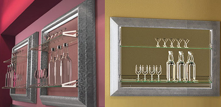 Strukture izrađene od vodootpornog melamina presvučenog laminatom ili ogledalom, sa bočnim stalcima za slobodno postavljanje dviju staklenih polica. Izbočeni aluminijski okvir u srebrnoj boji ili lakiran u svim RAL bojama. Rasvjetni sustav postavljen je izravno u gornji okvir. Linija OPERA dostupna je u jedinicama dužine 1150 i 1500 mm.