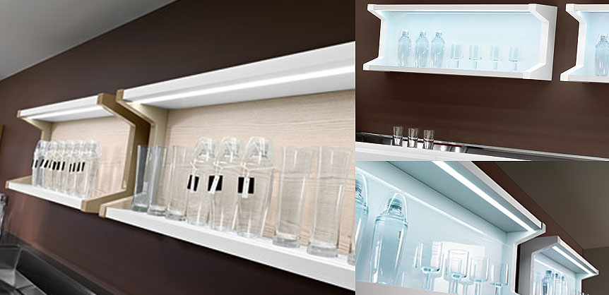 Zidne jedinice SPOT izrađene su od anodiziranih aluminijski hprofila i bočnih elemenata od lakiranog poliuretana visoke gustoće. Integrirana LED rasvjeta u gornjem profilu. Pozadina zidnih jedinica dostupna je u laminatu ili lakiranom drvu u svim RAL bojama.